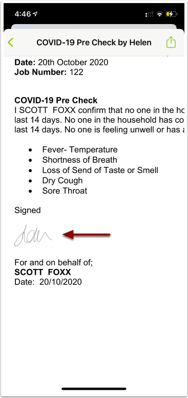 You hand over your iPhone or iPad for the customer to sign in the box on the ServiceM8 app, but they can’t actually review the form, because you haven’t been able to produce it yet….