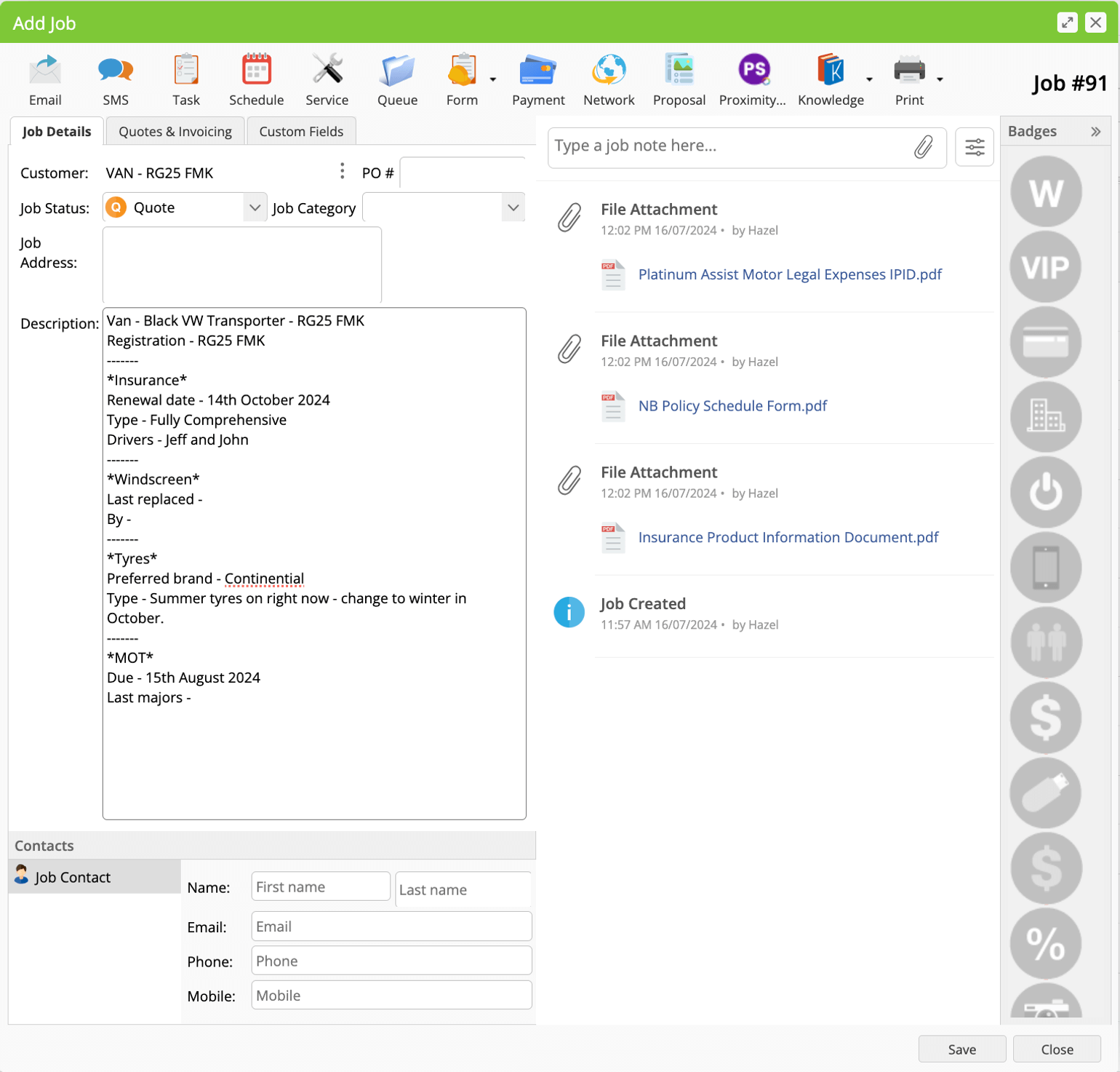 You can add the insurance policy documents to the job diary, along with any receipts that relate to van purchases.