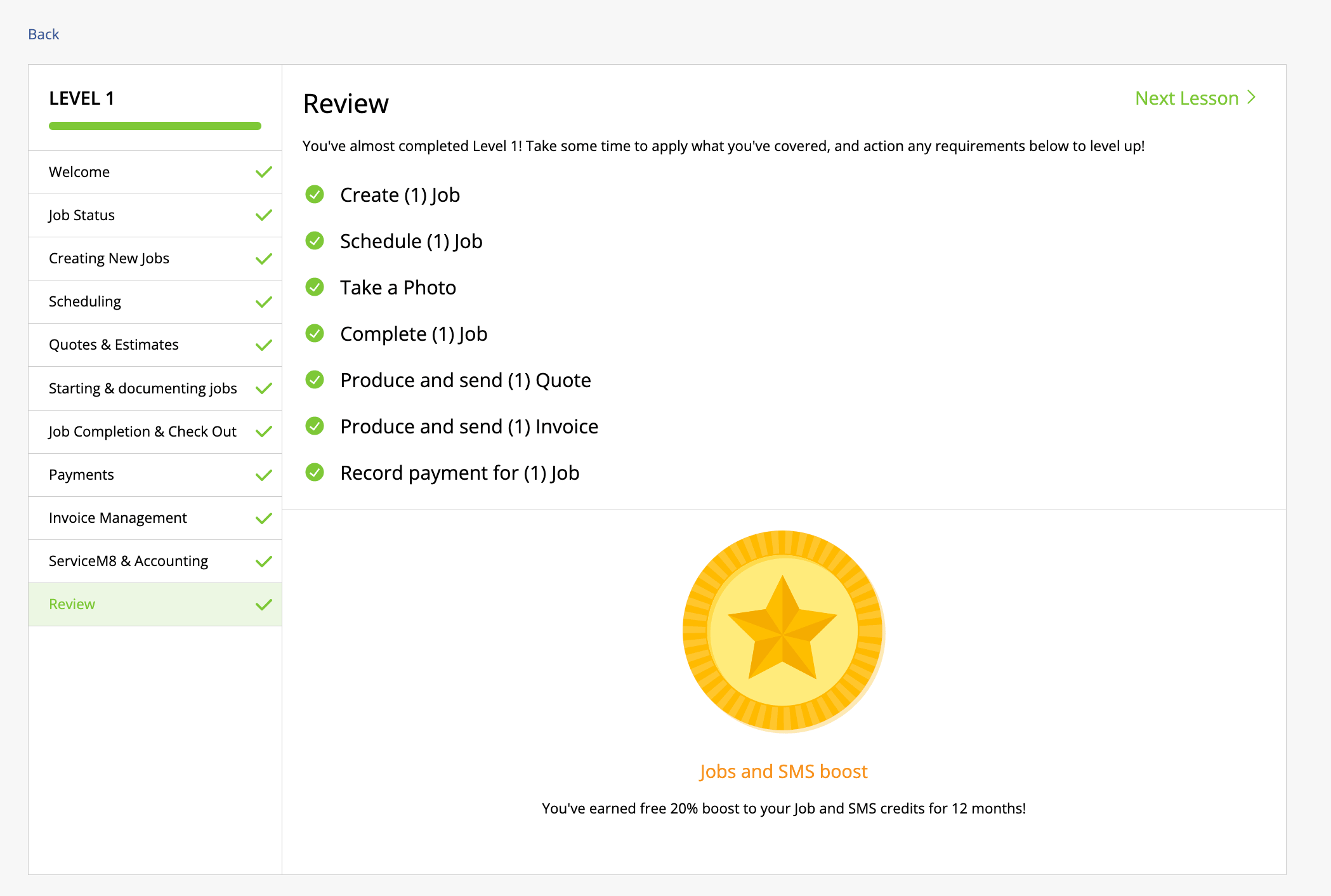 ⭐ Level 1: The Basics (for all staff) Complete the basics — creating jobs, scheduling, quotes, invoices and payments, and you’ll earn a 20% boost to your Job and SMS credits for 12 months.