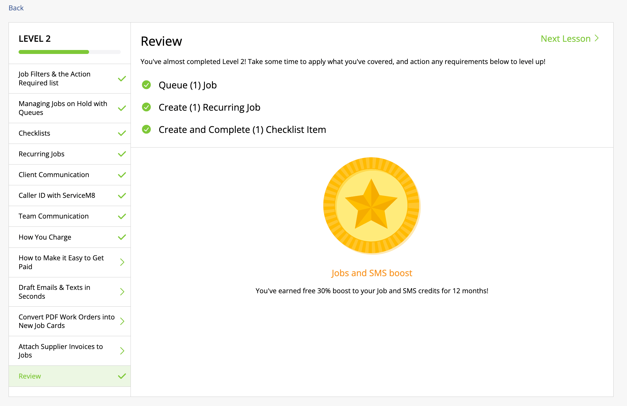 ⭐ Level 2: Core Concepts (for operations staff and owners) Work through queues, recurring jobs, checklists and client communication, and you’ll earn a 30% boost to your Job and SMS credits for 12 months.