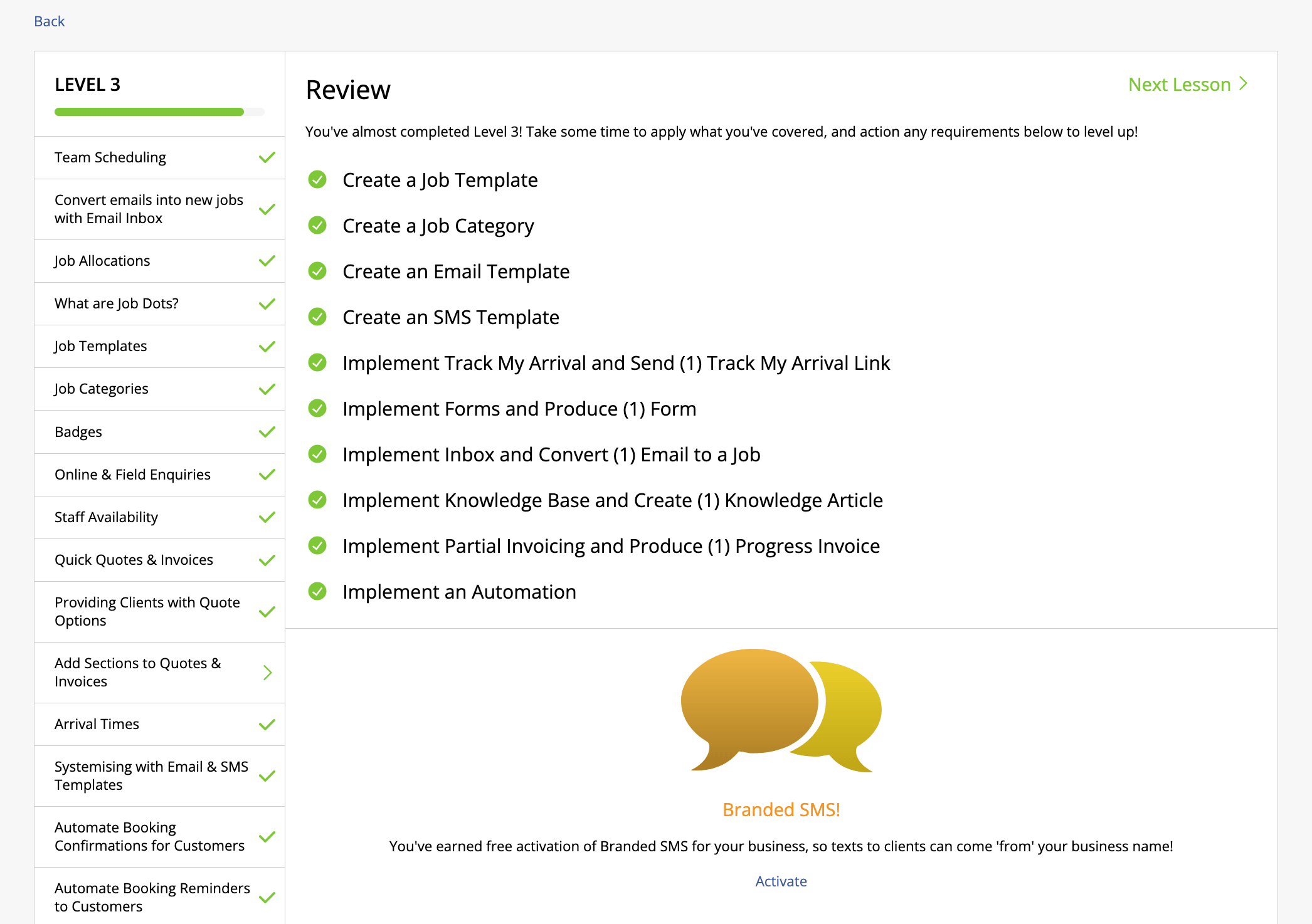 ⭐ Level 3: Quick Wins (for operations staff and owners) This level covers job templates, email inbox, team scheduling and automations. Complete it and you’ll unlock free Branded SMS – so your texts to clients come from your business name, rather than a random number. 📱
