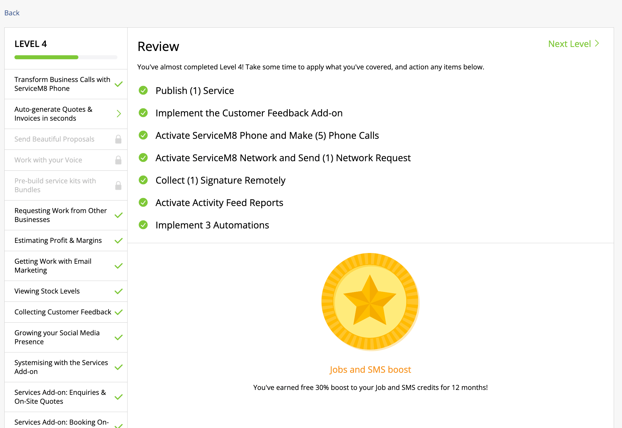 ⭐ Level 4: Powerful Features (for operations staff and owners) The advanced stuff – auto-generating quotes and invoices, estimating profit and margins, email marketing and customer feedback. Complete it and you earn another 30% boost to your Job and SMS credits for 12 months.