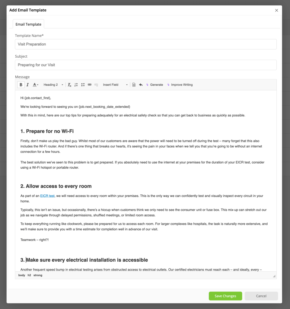 Use this to guide the customer through what they specifically need to do or think about before your team arrives. This means that your team can get in, get on with the job and get out quicker, with less hassle and frustration.