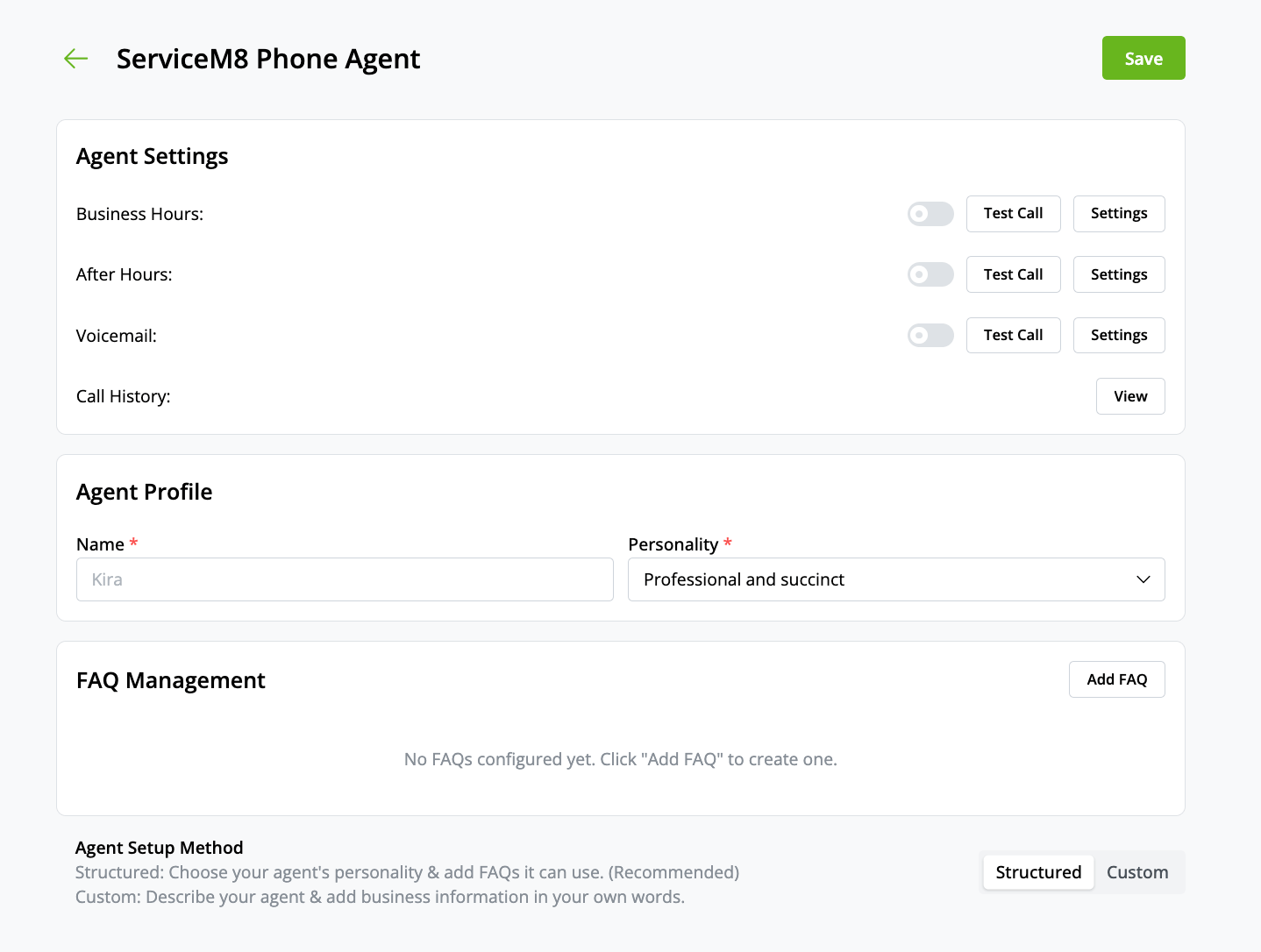Start simple. Set a clear greeting, decide what details you want captured (name, reason for calling is usually enough), and choose what happens next — for example creating a lead or job automatically.
