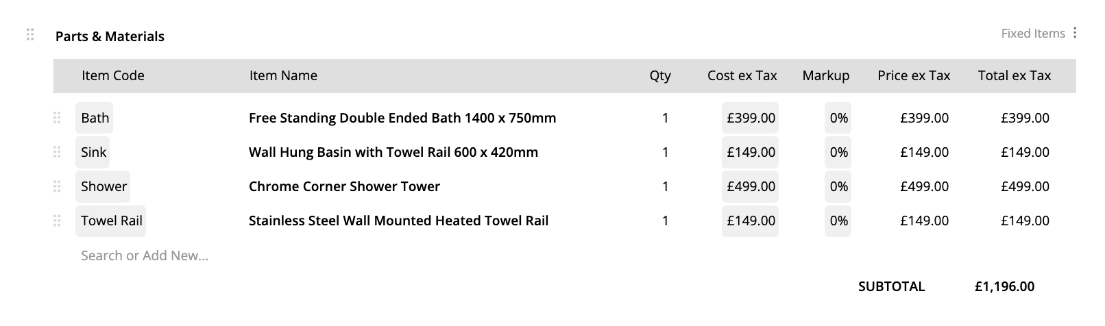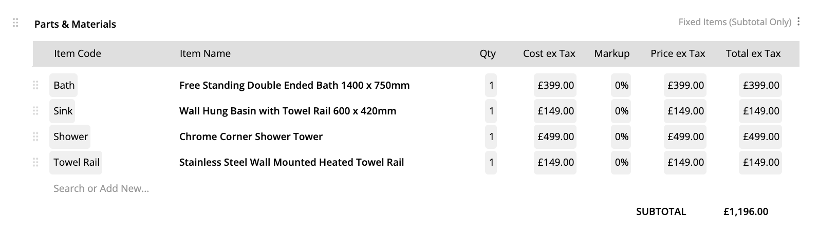 Here’s a normal fixed items materials table, where Item Name, Qty, Price ex Tax and Total ex Tax is visible to the customer: