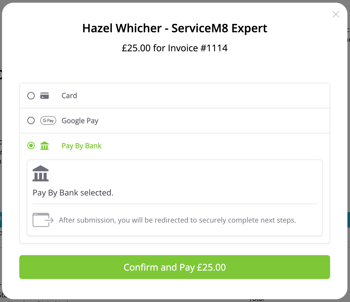- Offered automatically when you switch to ServiceM8 Pay and send an invoice with the payment link