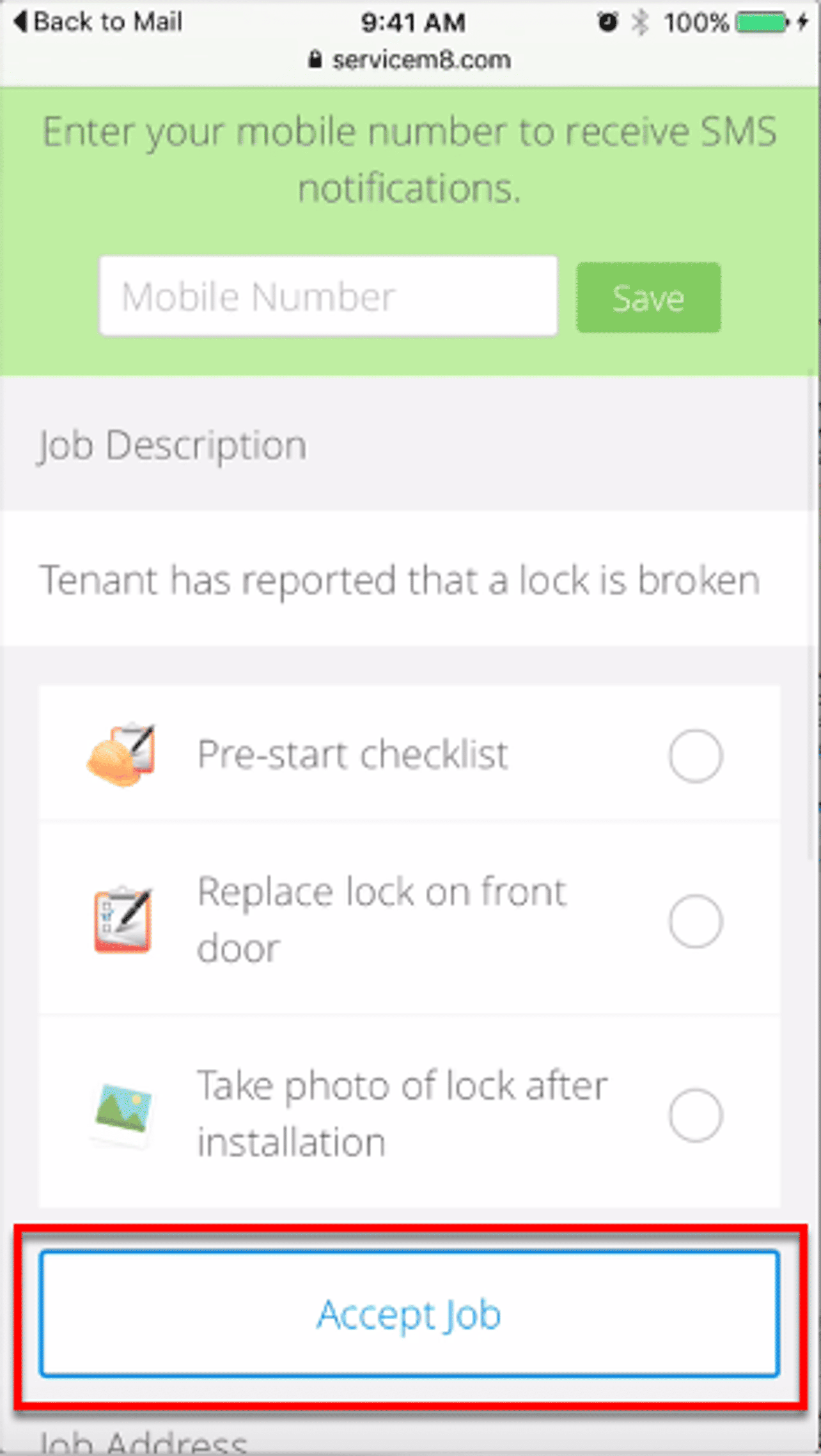 Otherwise, ServiceM8 will send a link to the e-mail address which allows the contractor to view the job details and complete the job requirements through a web browser.