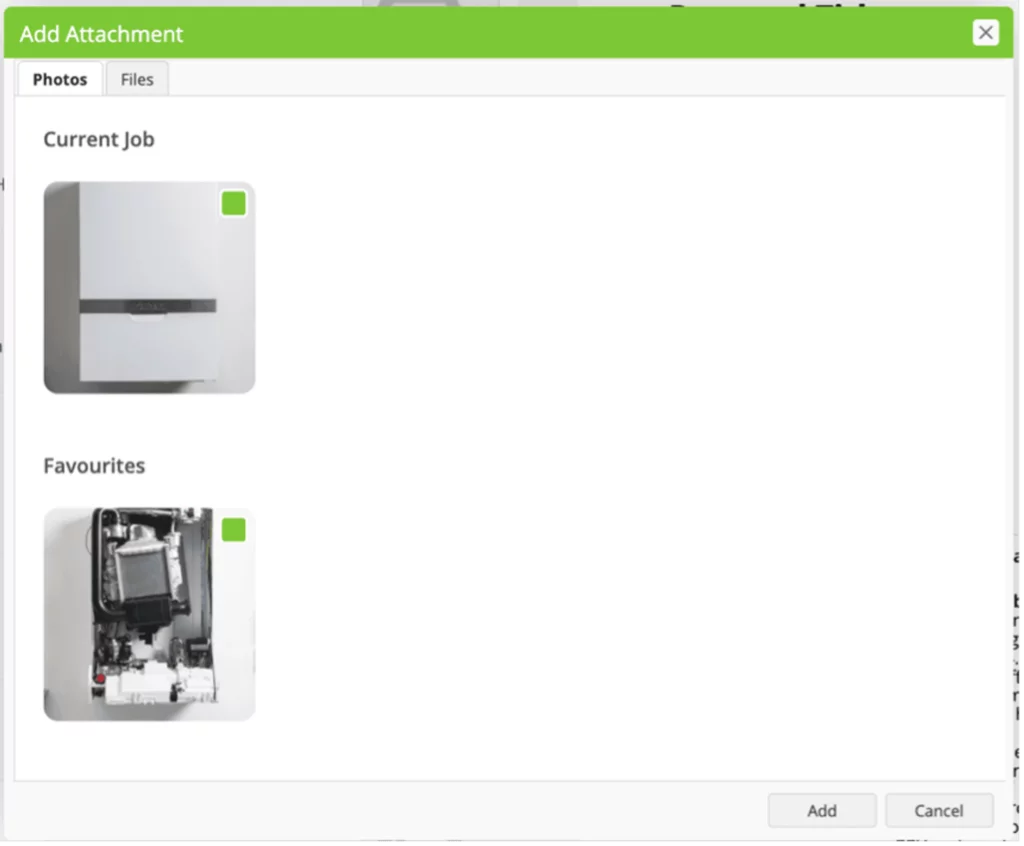 When you go to add a new photo to a proposal gallery section, you’ll be shown all of that job’s photos and the favourites.